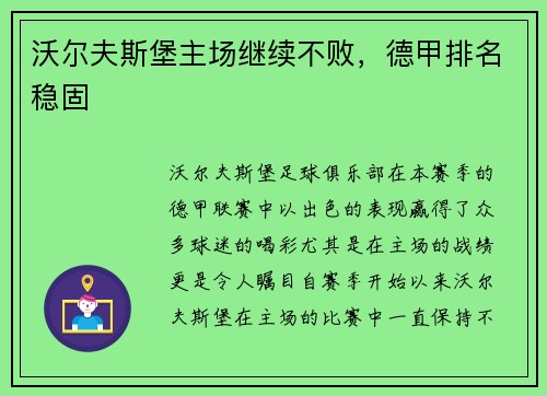 沃尔夫斯堡主场继续不败,德甲排名稳固